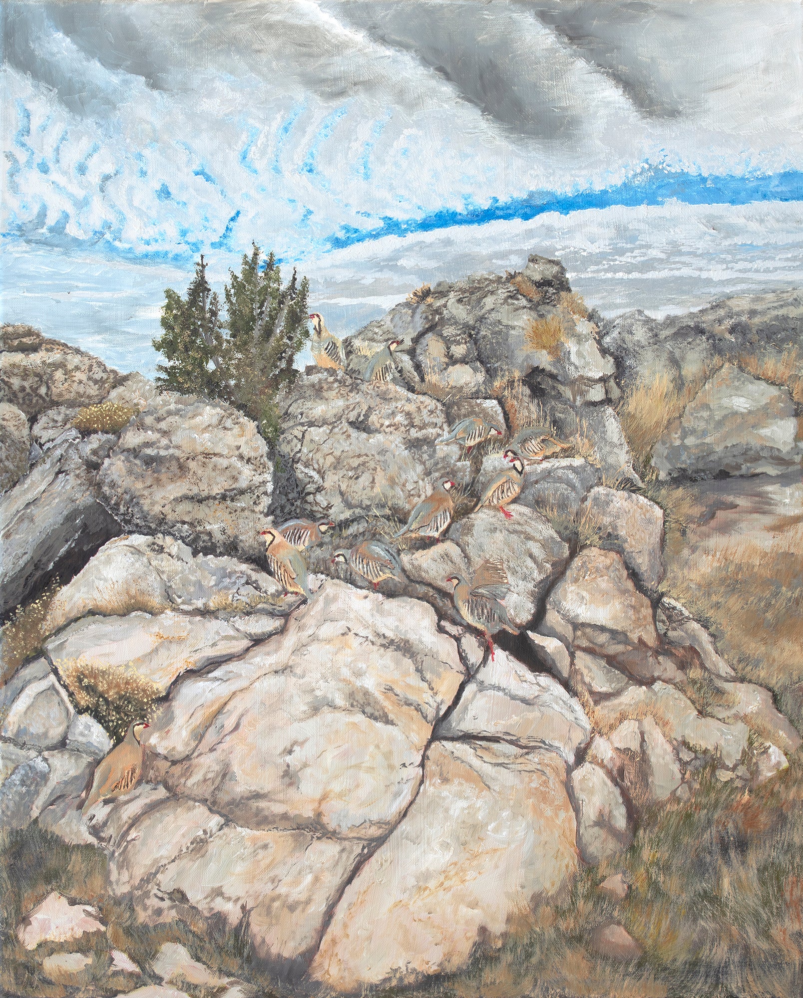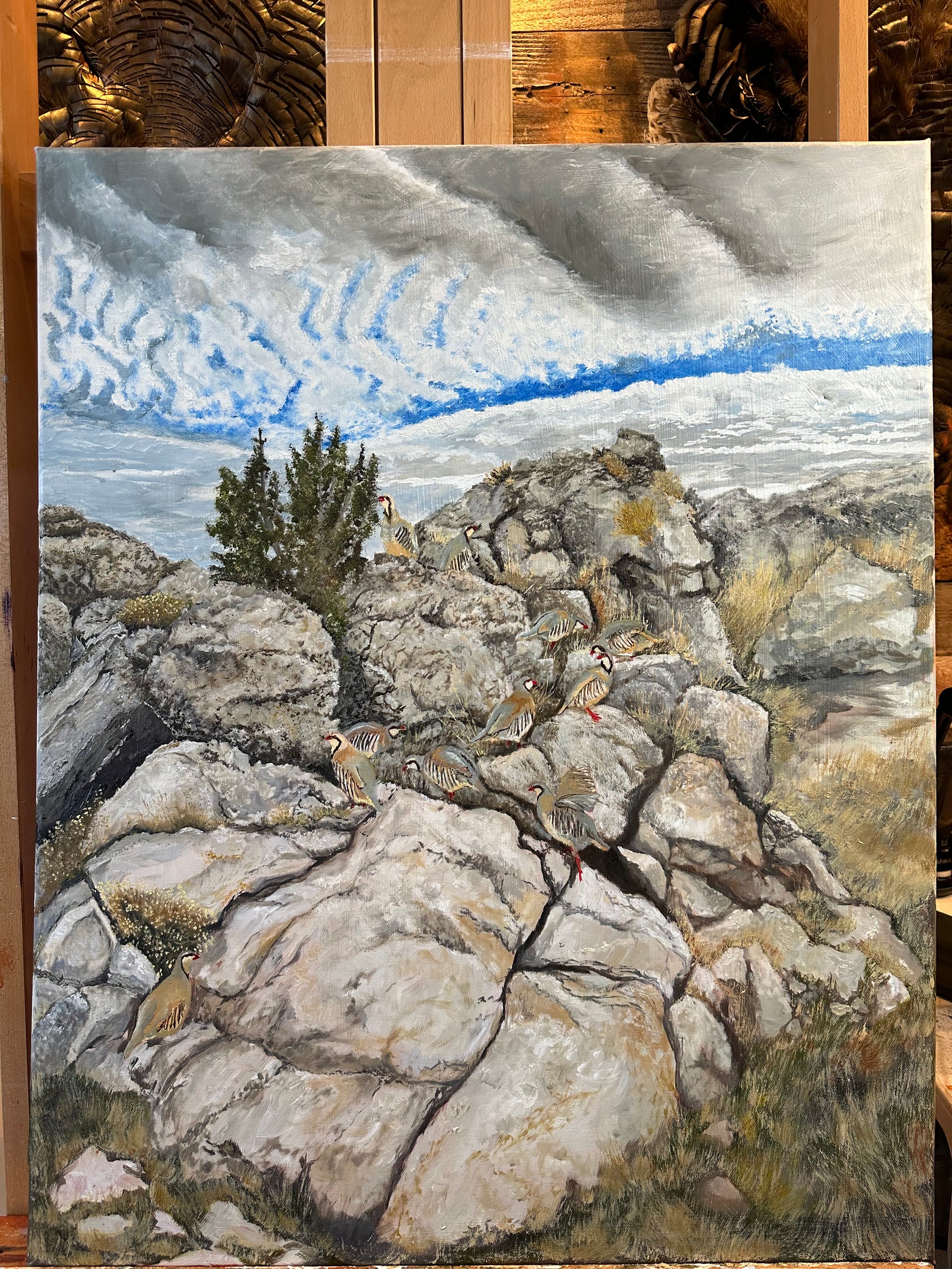 Cheat Grass Heaven captures a dynamic scene of a chukar covey skillfully ascending rocky terrain. This artwork highlights the bird's natural agility and the rugged beauty of its habitat, offering a detailed and authentic portrayal for enthusiasts of wildlife and nature. The composition brings focus to both movement and environment, making it an insightful piece for collectors who appreciate precision and naturalistic detail.